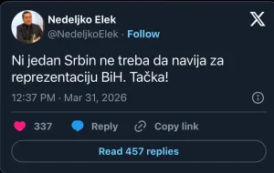 Objava Nedeljka Eleka na društvenoj mreži X izazvala je brojne reakcije širom Bosne i Hercegovine, nakon što je iznio stav o navijanju za reprezentaciju BiH. Njegova poruka brzo se proširila internetom i privukla veliku pažnju javnosti, pokrenuvši brojne rasprave među korisnicima.